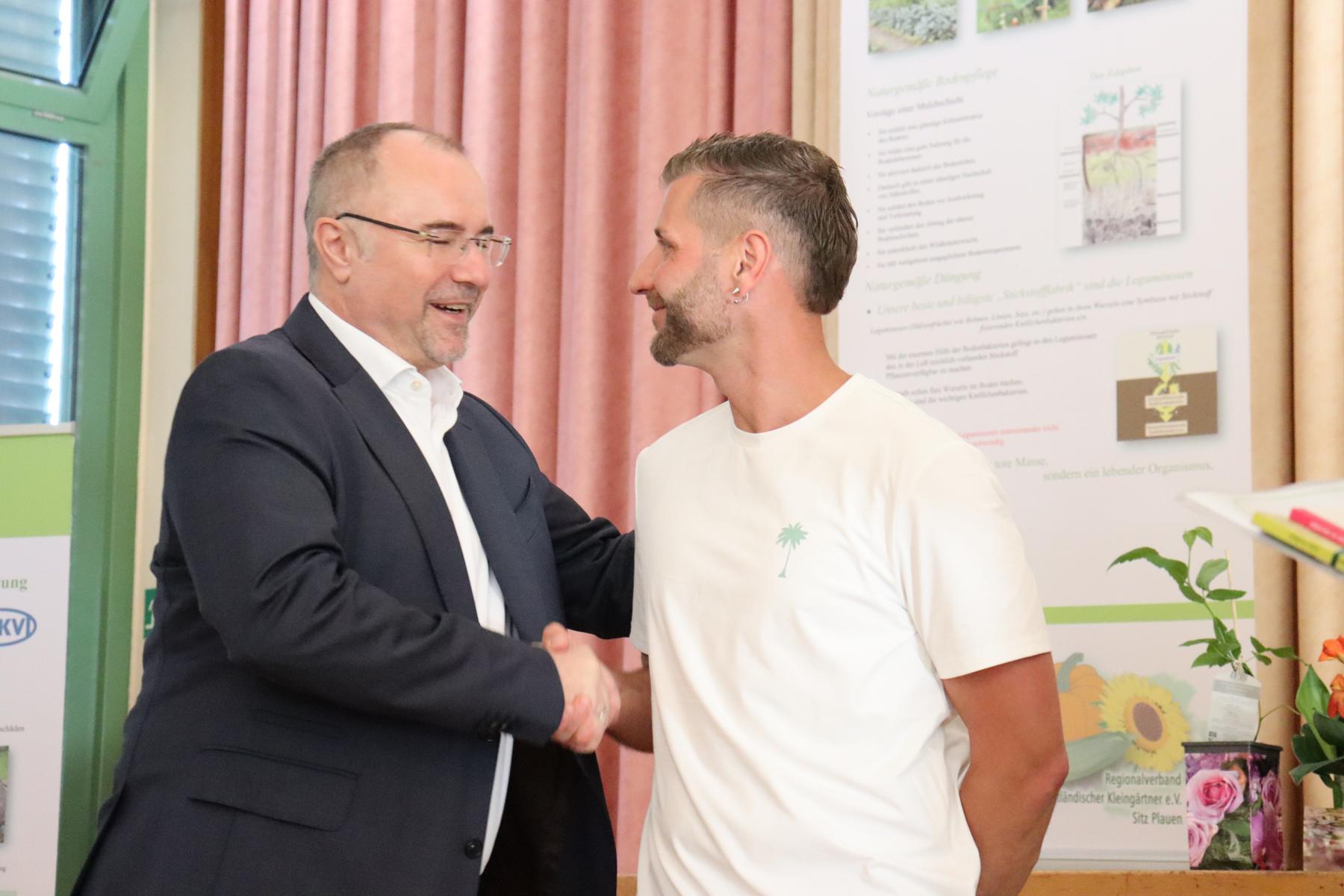 Eine besondere Würdigung erhielt der Vereinsvorsitzendem Frank Schubert, der sich seit 30 Jahren ehrenamtlich um das Wohle seines Vereines, dem KGV Immergrün II, kümmert und somit das Kleingartenwesen im Vogtland und der Stadt Plauen stärkt und prägt.