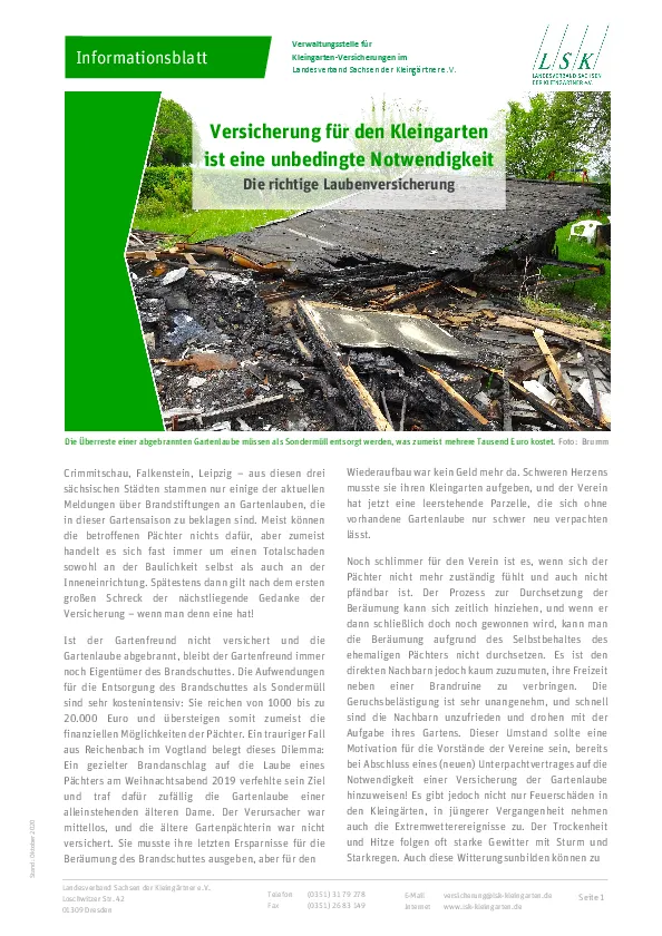 In den Verbänden des Landes Sachsen gibt es unterschiedliche Verträge mit Versicherungsgesellschaften. Wir bieten allerdings nur Versicherungen an, die durch Rahmenverträge des LSK abgeschlossen wurden. Hierdurch können wir unseren interessierten Gartenfreunden beste Preise anbieten.