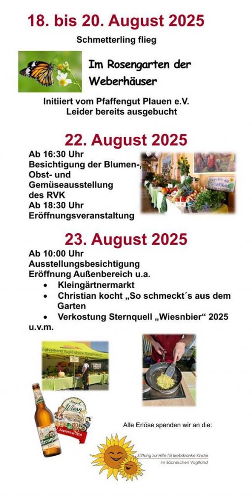 Am 23.08.2025 ab 10:00 Uhr öffnen wir die Ausstellung und vor dem Eingangsbereich zum Rathaus, den Kleingärtnermarkt, Infostände und den Genussraum, lassen Sie sich überraschen.